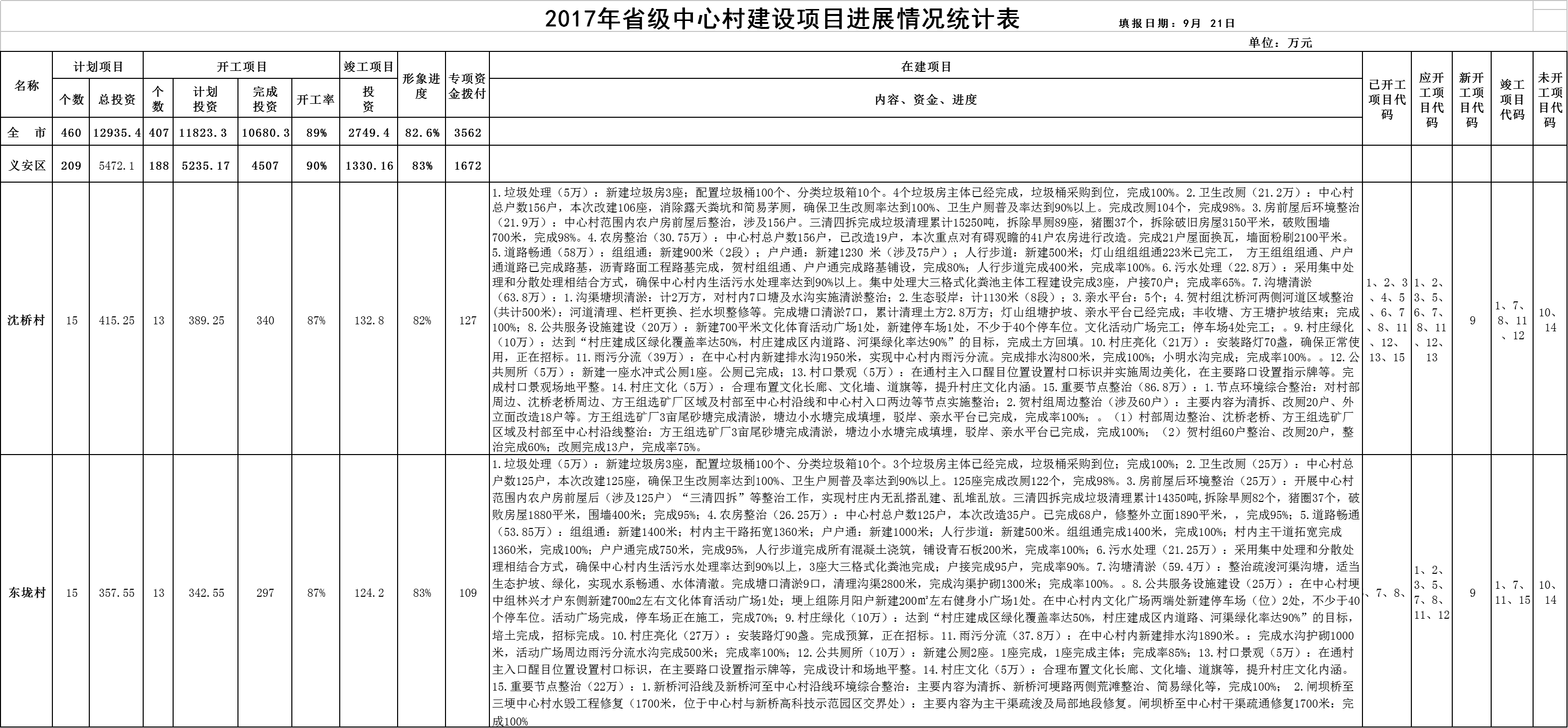 全市30个省级中心村计划安排建设项目460个,项目总投资12935.4万元。截至目前,共开工项目407个,开工率88.5%;比上一期调度新增开工项目43个,开工率提高9.5%;其中:枞阳县开工184个、开工率88%,义安区开工188个、开工率90%,郊区开工35个、开工率85%。完成投资10680.3万元,总体形象进度82.6%,比上一期调度新增加13.6%;其中:枞阳县形象进度83%,义安区形象进度83%,郊区形象进度80%。