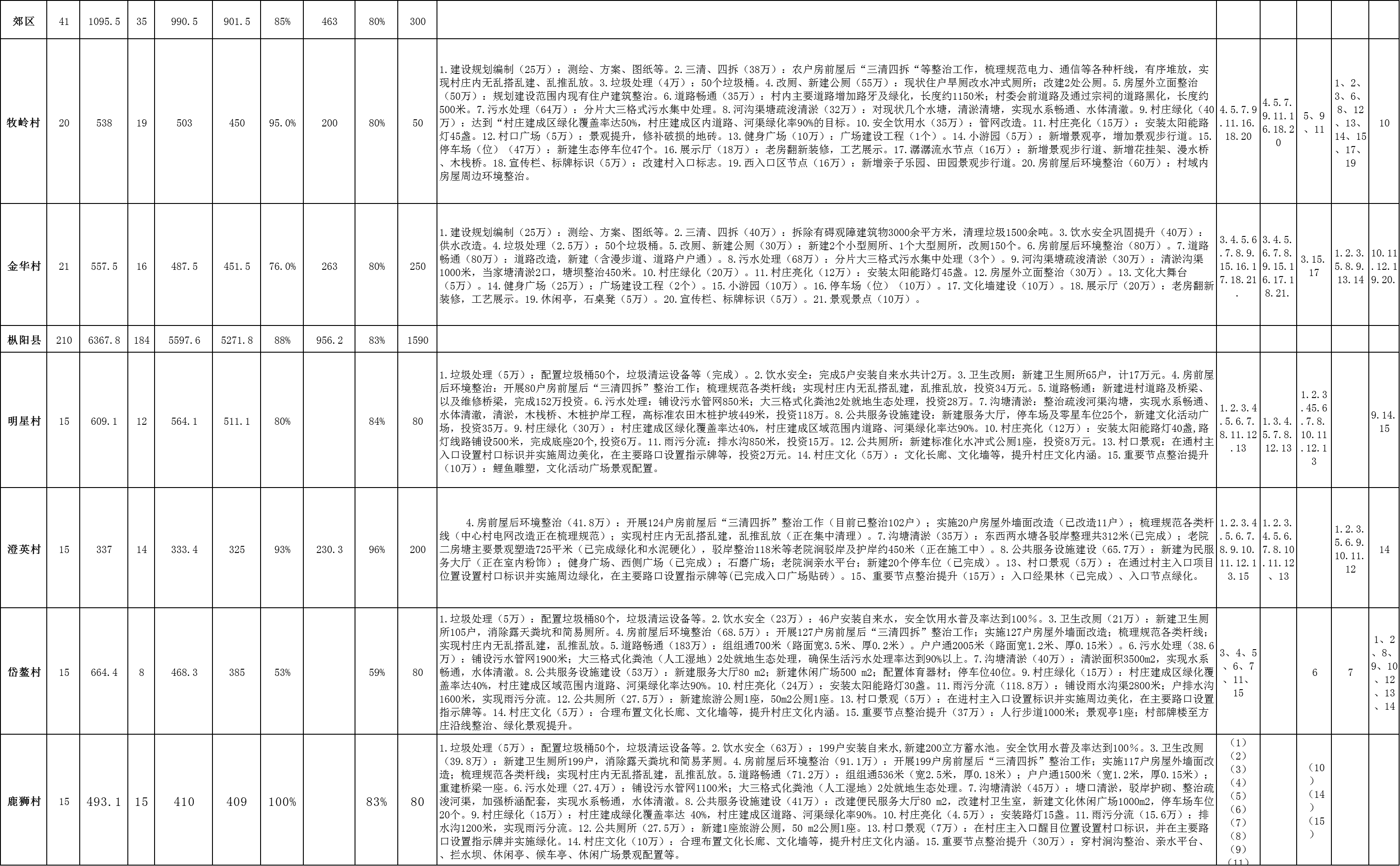 (四)房前屋后环境整治。中心村范围内农户房前屋后整治工作,累计清理垃圾约380971吨,拆除旱厕1942个,占任务总量97%,本月完成74个;拆猪圈1089个,占任务总量99%,本月完成20个。