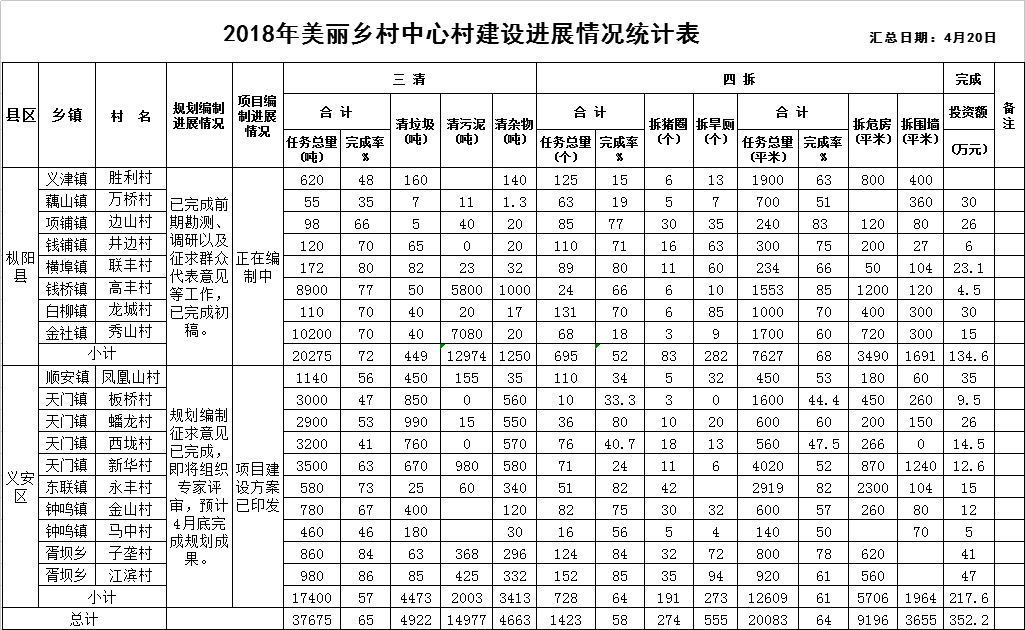 全市美丽乡村中心村建设规划编制、项目编制、三清四拆等前期工作进展如下: